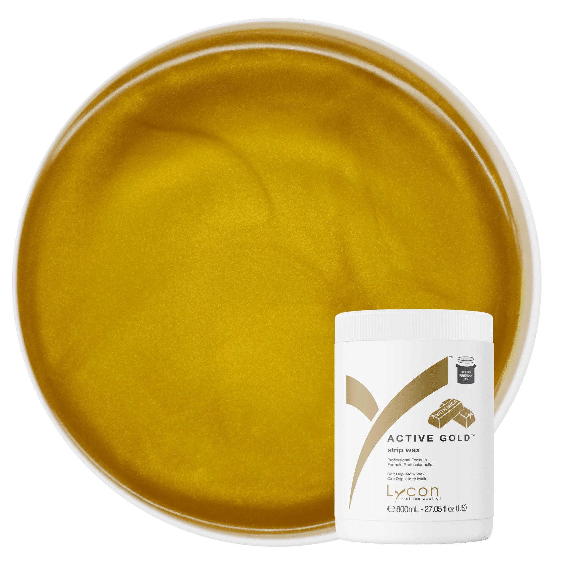 Lycon Active Gold Strip Wax delivers a golden glow while effectively removing unwanted hair, infused with soothing Chamomile and the finest Micro Mica for gentle and efficient waxing on legs, arms, chest, and back. SKU: G348.