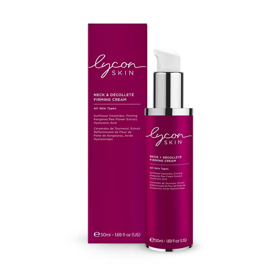 Indulge in the luxury of Lycon Neck + Decollete Firming Cream, a nourishing blend of botanicals, including Australian Kangaroo Paw Flower Extract, Macadamia Nut Oil, Algae Extract, and Yeast Beta-Glucan, Lycon’s anti-aging powerhouse.